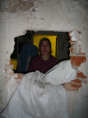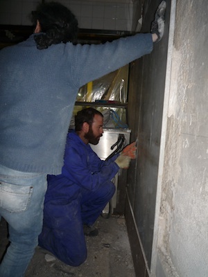 Vamos retirando con tiento las pesadas planchas de marmol de la pared, que reutilizaremos para hacer el suelo nuevo.